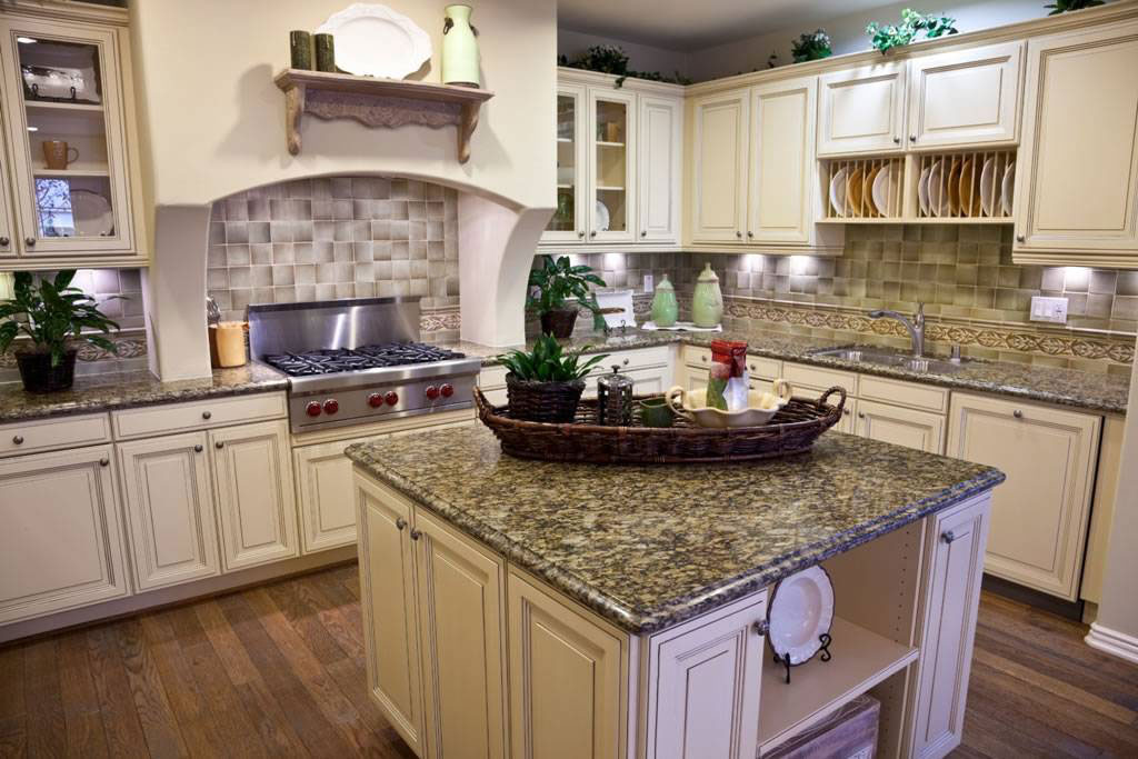 San Cecilia Granite is a popular choice for traditional kitchens. Its gold base with brown and burgundy flecks pairs beautifully with wood cabinetry.