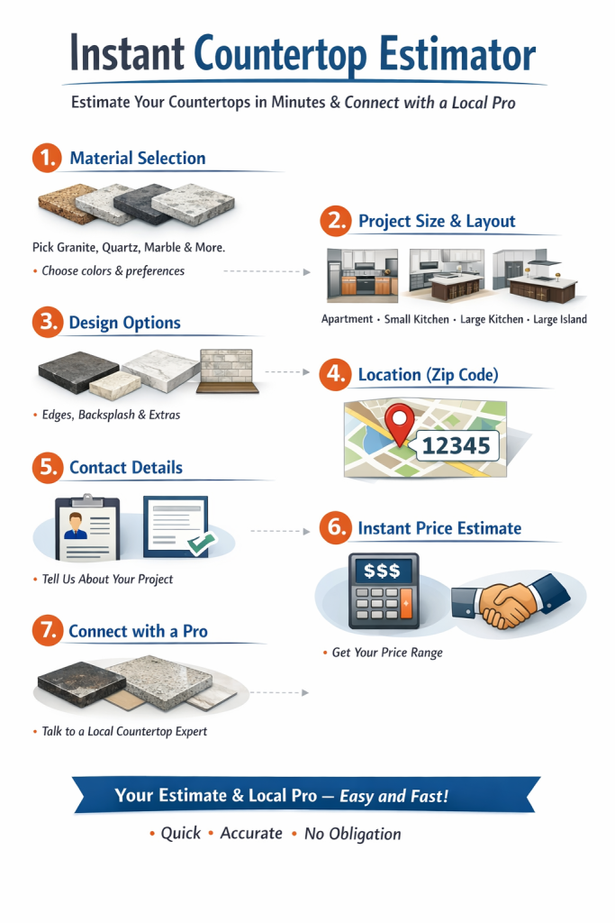 Instantly estimate your countertop project and get connected with a local countertop fabricator. Easy to use, fast results, and a no-obligation consultation to review your project and pricing.